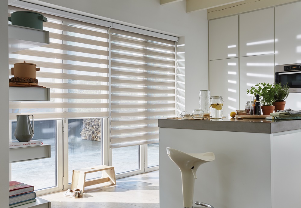 As persianas double vision são compostas por uma camada de tecido opaca e uma camada transparente e podem ser usadas em duas posições.